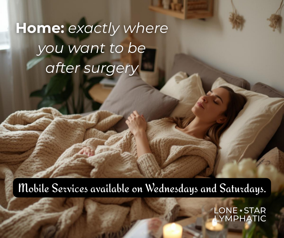 Limited mobile lymphatic massage is available for post-operative clients who are unable or uncomfortable traveling. This short-term service supports early recovery and carries a higher fee due to travel and setup. In-office sessions are recommended once mobility improves.